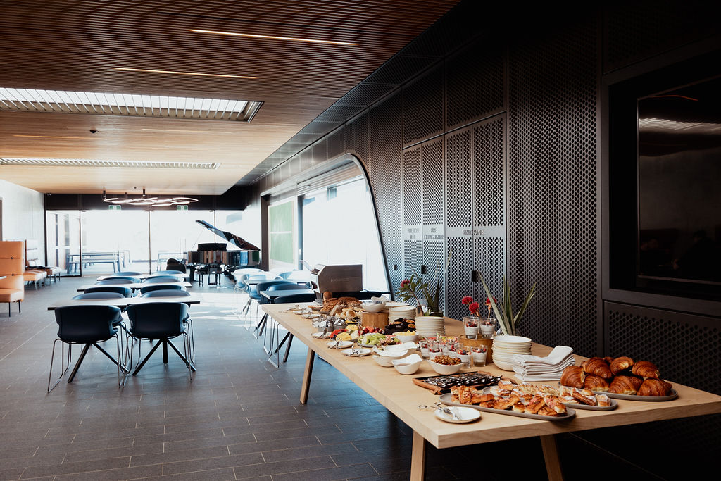 Because the schedule was tight, morning tea was served inside the Boardroom, with individual coffee orders taken and delivered to keep things flowing. A hot lunch buffet was served in the courtyard, giving the team a true reset break. Fresh air, clear heads, then back to the table for the afternoon stretch.